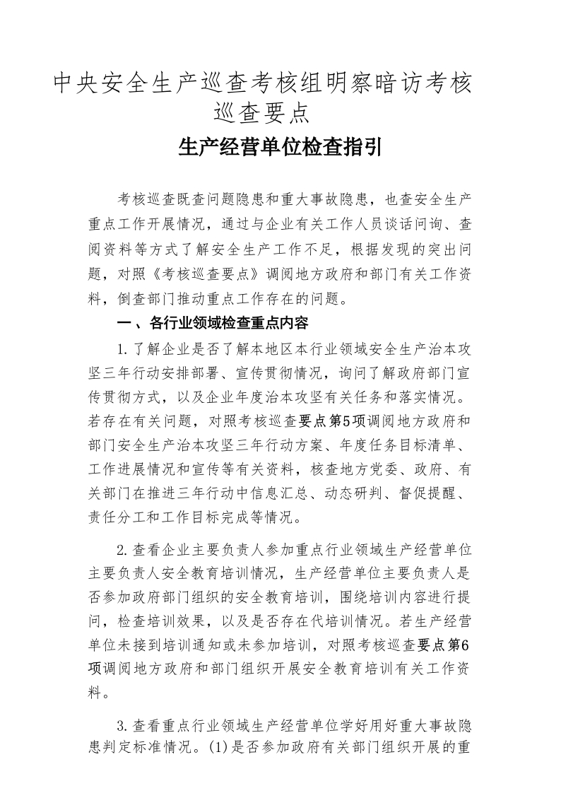 【要点】中央安全生产巡查考核组明察暗访考核巡查要点《生产经营单位检查指引》(14页)