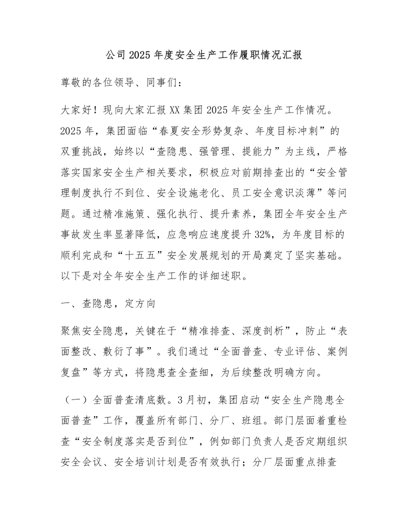 首页安全文档综合公司2025年度安全生产工作履职情况汇报