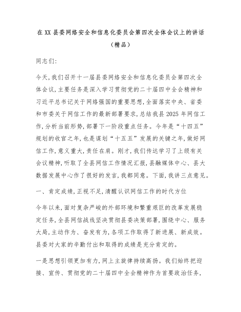 在XX县委网络安全和信息化委员会第四次全体会议上的讲话(精品)