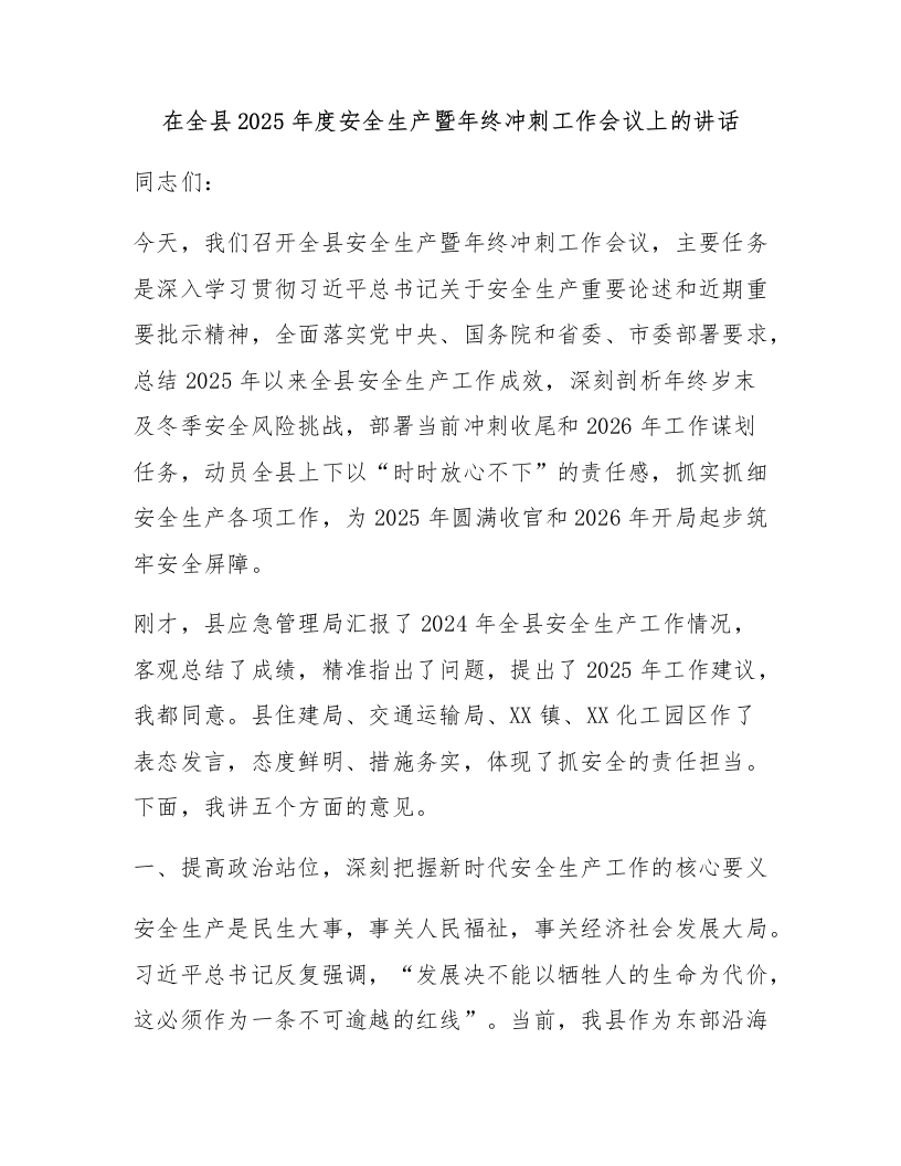 首页安全文档综合在全县2025年度安全生产暨年终冲刺工作会议上的讲话