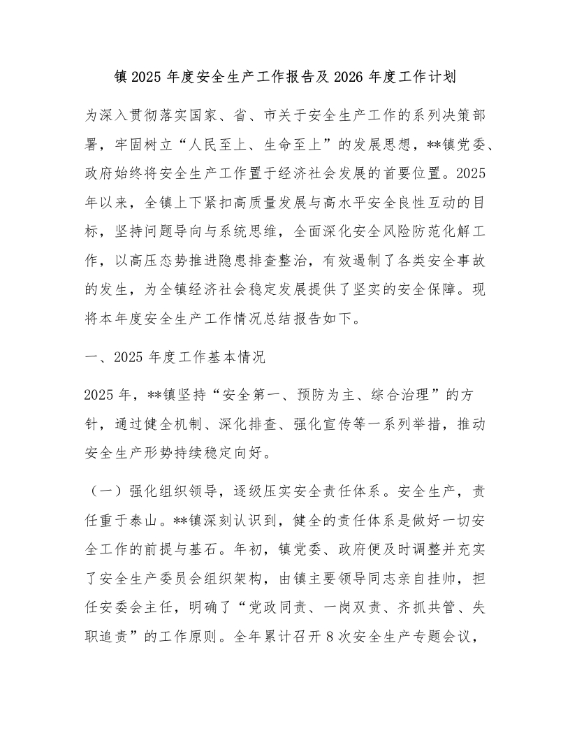 首页安全文档综合镇2025年度安全生产工作报告及2026年度工作计划